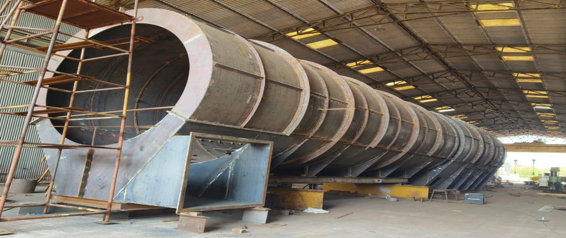 Large cylindrical shell under fabrication, used in cement, fertilizer